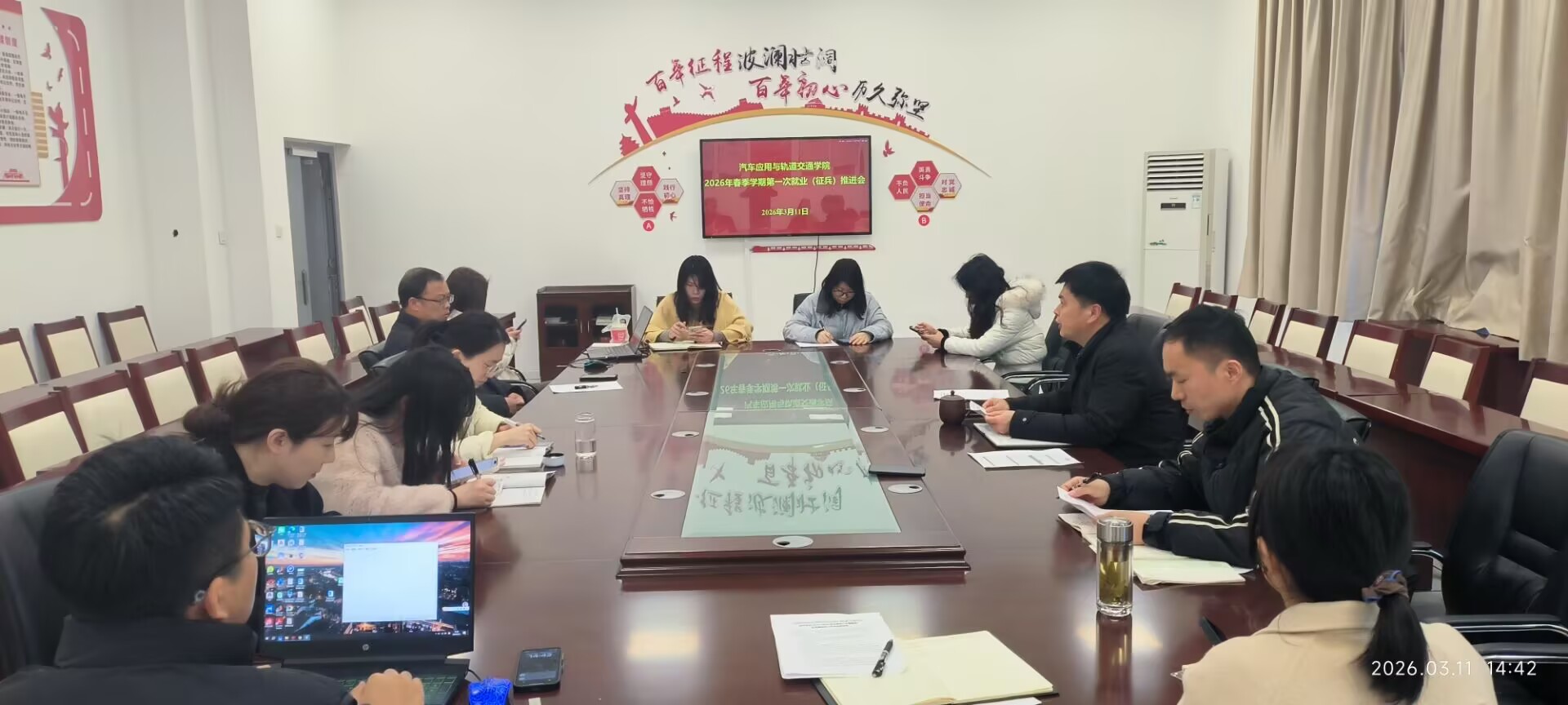 || 3月11日,汽车应用与轨道交通学院在学院会议室召开2026届毕业班全体辅导员春季学期首次就业(征兵)推进会议。我院党总支副书记(主持工作)尹仕果、党总支副书记梁雯婷、2026届全体毕业班辅导员及我院就业工作人员参加会议。会议旨在深入贯彻落实教育部及学校关于高校毕业生就业工作的决策部署,分析当前就业形势,明确下一阶段工作重点,全力推动2026届毕业生高质量充分就业。会议伊始,我院就业负责老师李秋晓领学了教育部关...